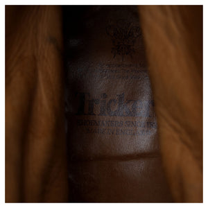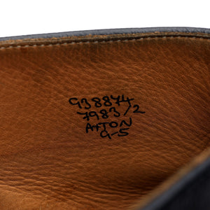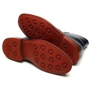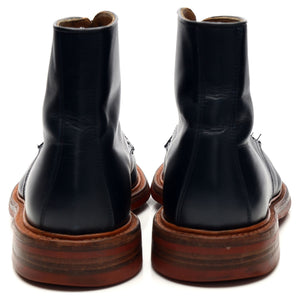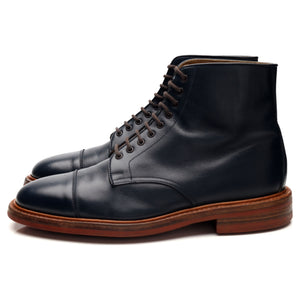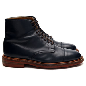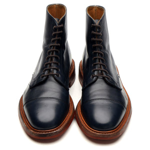 Tricker's 'Axton' cap toe boots in navy blue calf. In excellent used condition, showing minor signs of wear.