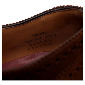 Loake 1880 Export Grade 'Trinity' oxford semi brogues in Cinnamon snuff brown suede. In excellent used condition, showing minor signs of wear.
