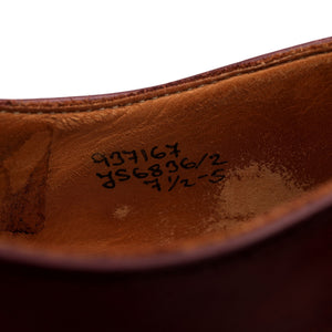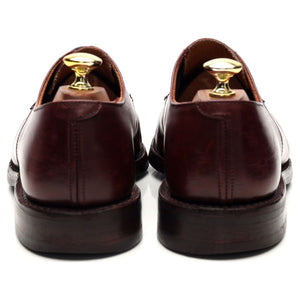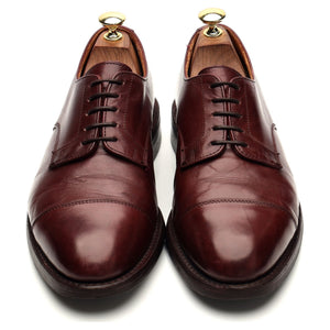 Tricker's cap toe derby in burgundy calf. In very good used condition, showing moderate signs of wear.