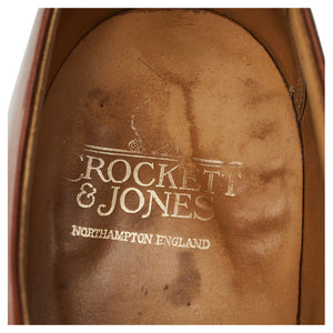 Crockett & Jones apron front split toe derby in tan brown calf. In very good used condition, showing moderate signs of wear.