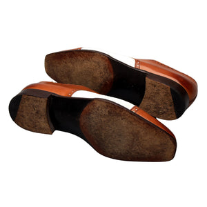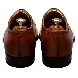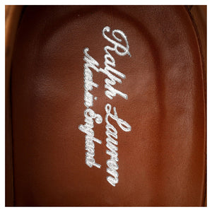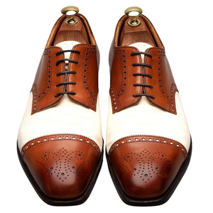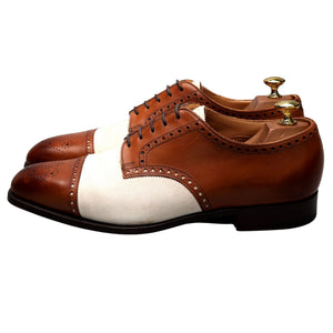 Edward Green manufactured for Ralph Lauren Purple Label cap toe derby in tan brown calf and white suede. In excellent used condition.