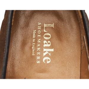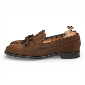 Loake 'Lincoln' tassel loafers in brown suede. In excellent used condition, showing minor signs of wear.