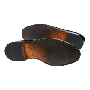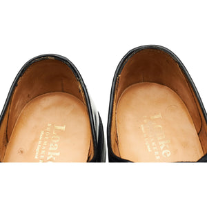 Loake '771' plain toe derby in black polished calf. In excellent used condition, showing minor signs of wear and with creasing across the vamps.