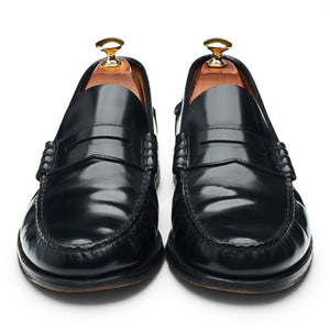 Loake 'Princeton' unlined penny loafers in black polished calf. In excellent used condition, showing minor signs of wear and light creasing across the vamps.