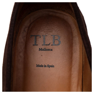 TLB Mallorca '2034 Sacchetto' penny loafers in dark brown suede. In excellent used condition, showing minor signs of wear.
