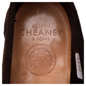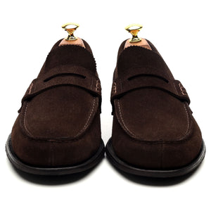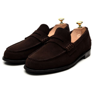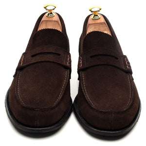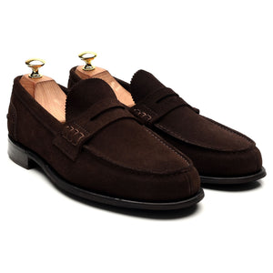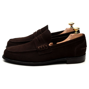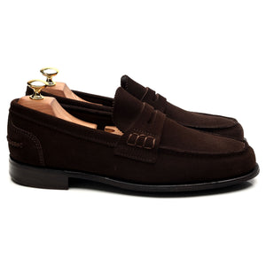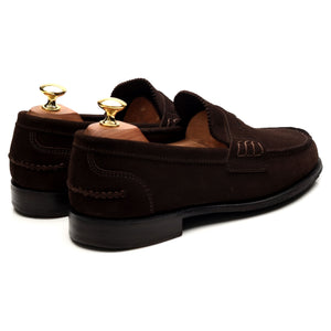 Cheaney 'Dover' penny loafers in dark brown suede. In excellent used condition, showing minor signs of wear.