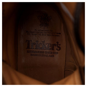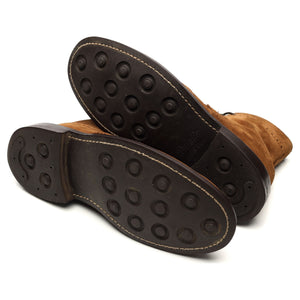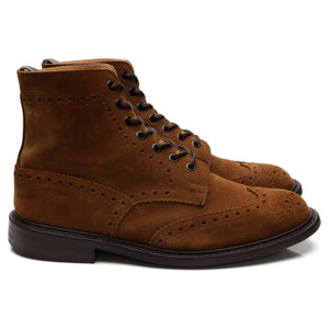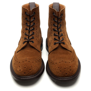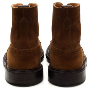 Tricker's 'Stow' brogue boots in snuff brown suede. In excellent used condition, showing minor signs of wear.