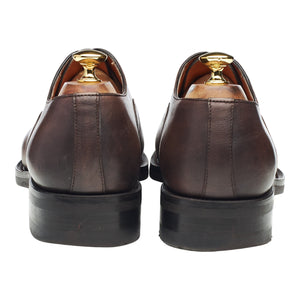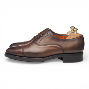 Santoni cap toe oxford in dark brown burnished calf. In excellent used condition, showing minor signs of wear.