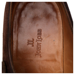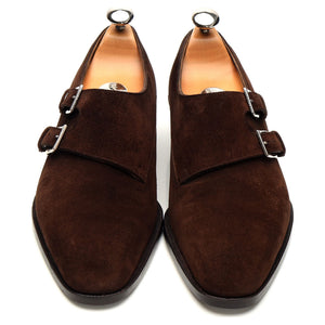 John Lobb 'Chapel' double buckle monk strap in dark brown suede. In excellent condition, showing minor signs of wear.