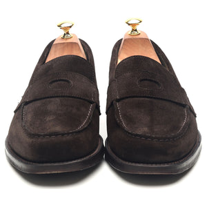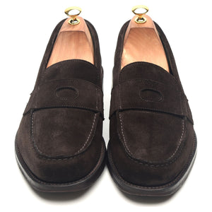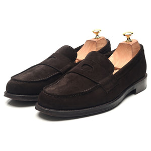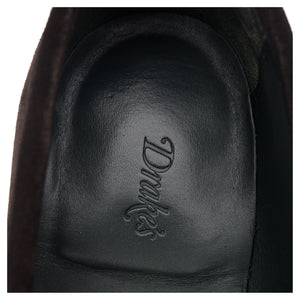 Drake's 'Charles' penny loafers in dark brown suede. In excellent used condition, showing minor signs of wear.