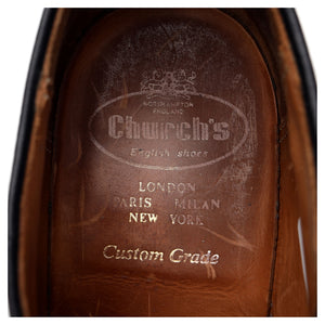Church's 'Grafton' derby brogue in burgundy polished calf. In excellent used condition, showing minor signs of wear.