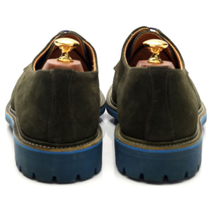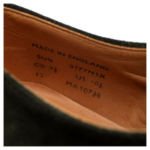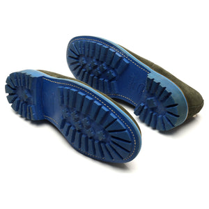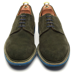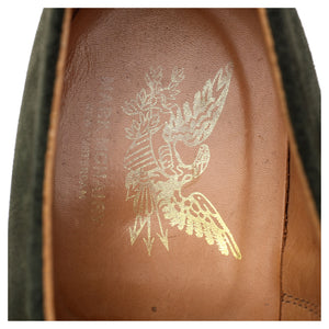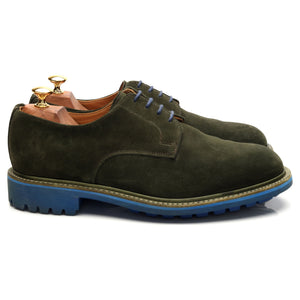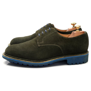 Sander's manufactured for Mark McNairy plain toe derby in green suede. In excellent used condition, showing minor signs of wear.