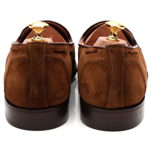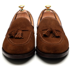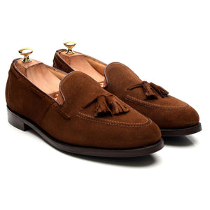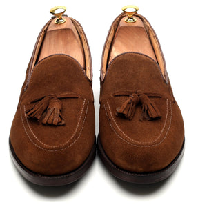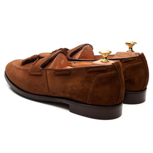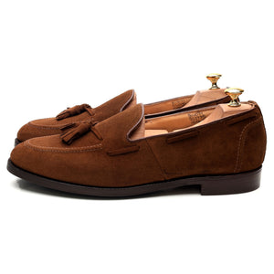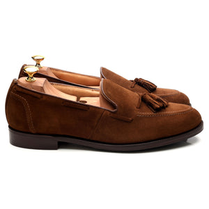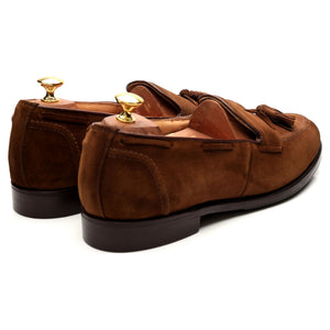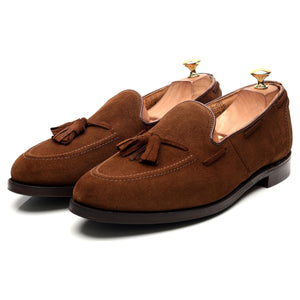 Tricker's tassel loafers in snuff brown suede. In excellent condition, with some residual glue marks on the inside linings.