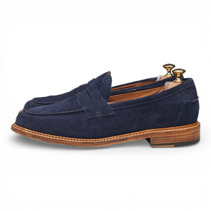 Sanders 'Isaac' penny loafers in navy blue suede. In excellent used condition, showing minor signs of wear.