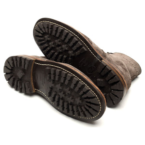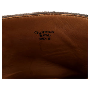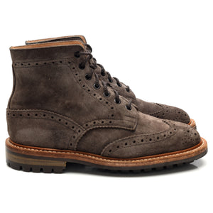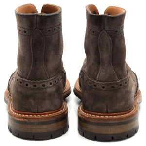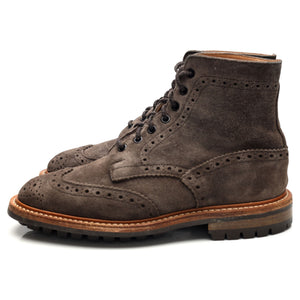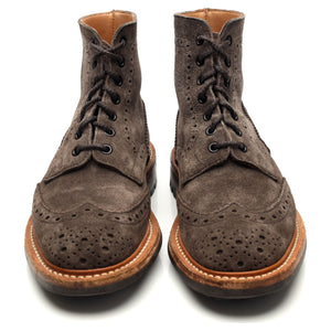Tricker's 'Stow' brogue boots in grey suede. In excellent used condition, showing minor signs of wear.