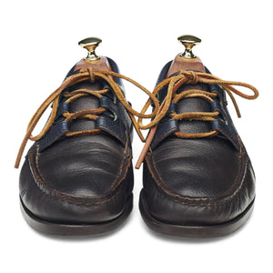 Yuketen 'Ghillie Moc' boat shoes in dark brown and navy blue calf. In excellent used condition with minor signs of wear.