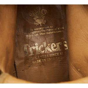 Tricker's 'Stow' brogue country boots in sand suede. In excellent used condition, showing minor signs of wear.