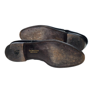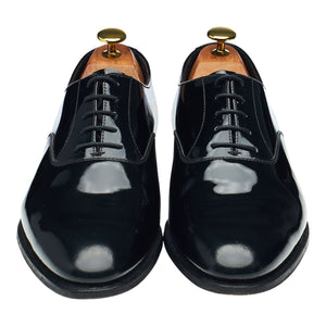 Crockett & Jones 'Overton' oxford in black patent leather. In excellent used condition, showing minor signs of wear.
