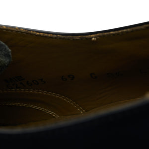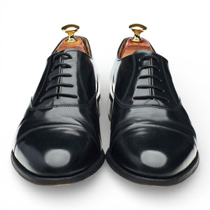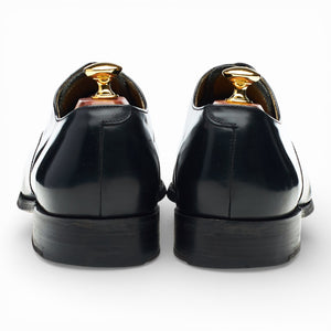 Barker manufactured for Russell & Bromley cap toe oxford in black polished calf. In excellent used condition, showing minor signs of wear and light creasing across the vamps.
