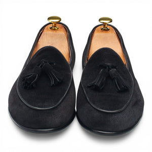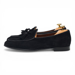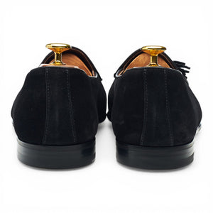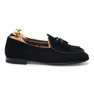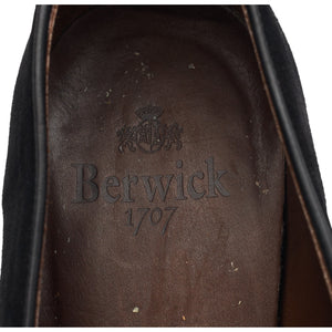 Berwick '4951' Belgian tassel loafers in black suede. In excellent used condition, showing minor signs of wear.