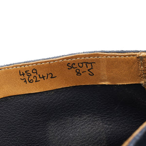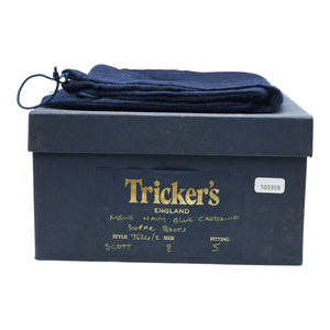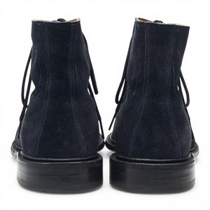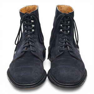 Tricker's 'Scott' unlined cap toe boots in navy blue Castorino suede. In excellent used condition, showing minor signs of wear.
