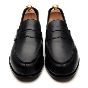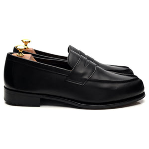 Mocassins à bout fendu « Cannes » en veau noir, fabriqués par George Cleverley pour Thom Sweeney. En excellent état d'usage.