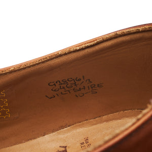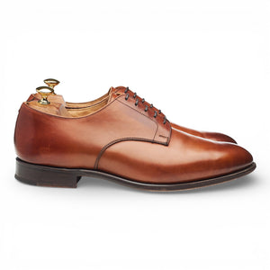 Tricker's 'Wiltshire' plain toe derby in tan brown burnished calf. In excellent used condition, showing minor signs of wear.