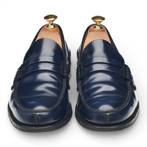Church's 'Tunbridge' unlined penny loafer in navy blue Fume polished calf. In excellent used condition.