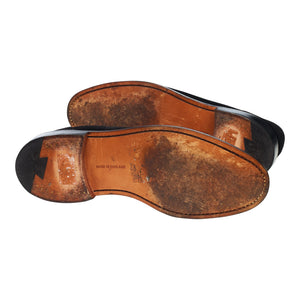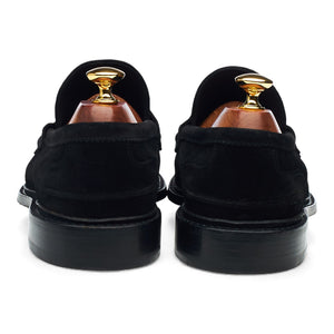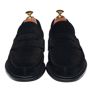 Tricker's 'Adam' unlined split toe penny loafer in black suede. In excellent used condition.