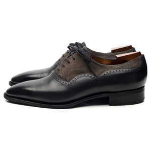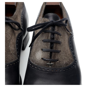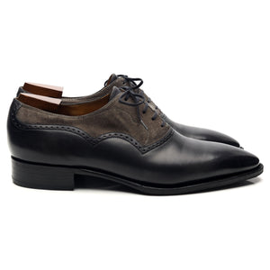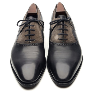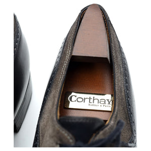 Richelieu Corthay « Wilfrid » en veau patiné bleu-gris et daim patiné gris. En excellent état d'usage, présentant de légères traces d'usure.