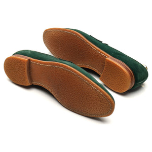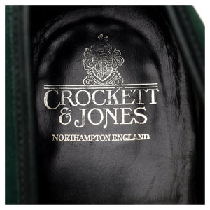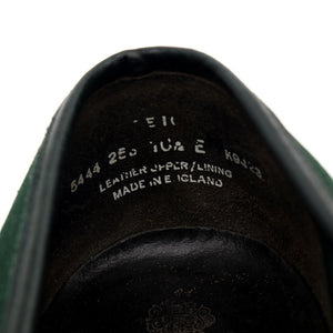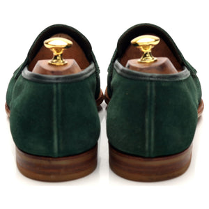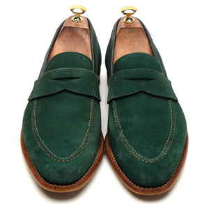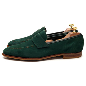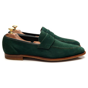 Crockett & Jones 'Teign' unlined penny loafer in green suede. In excellent used condition, showing minor signs of wear.