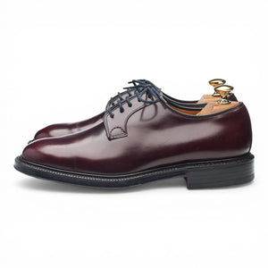 Church's 'Stratton' plain toe derby in burgundy polished calf. In excellent used condition, showing minor signs of wear.