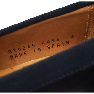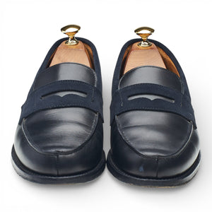 Berwick '4456' split toe penny loafers in navy blue calf and suede. In excellent used condition, showing minor signs of wear.