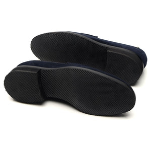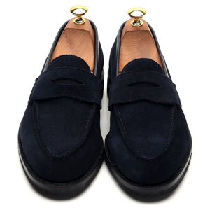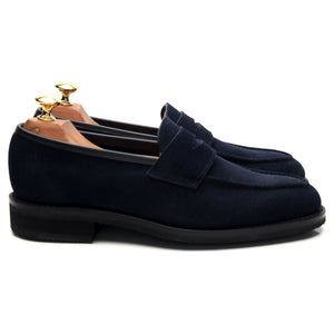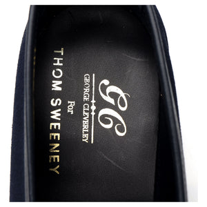 George Cleverley a fabriqué pour Thom Sweeney le mocassin « Bradley 2 » en daim bleu marine foncé.