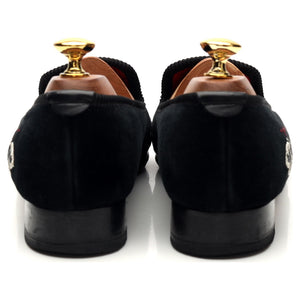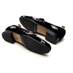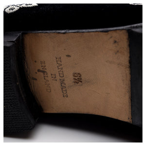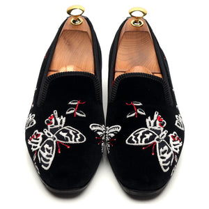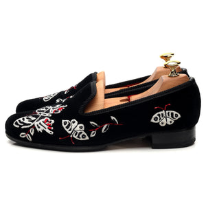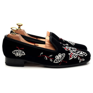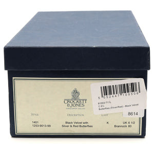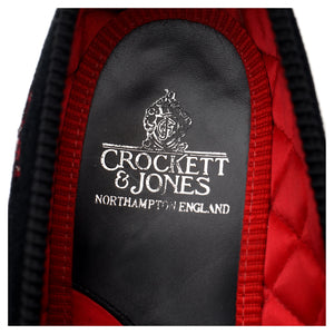 Chaussons Crockett & Jones en velours noir avec broderies papillons argentés et rouges. En excellent état d'usage, présentant quelques légères traces d'usure.