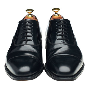 Church's 'Coppice' cap toe oxford in black polished calf. In excellent used condition, showing minor signs of wear and light creasing across the vamps.
