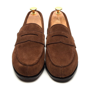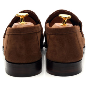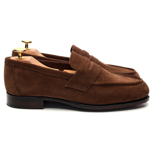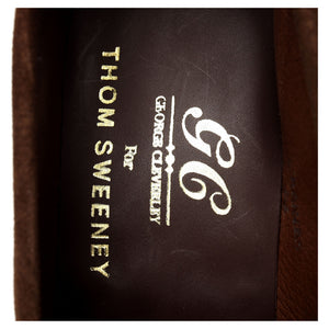 George Cleverley a fabriqué pour Thom Sweeney le mocassin à bout fendu « Cannes » en daim marron « Sigaro ».