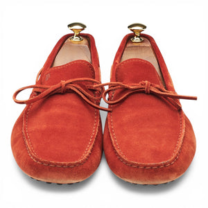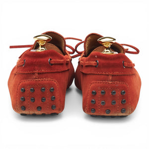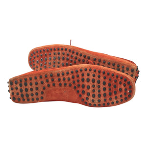 Tod's Gommino driving loafers in red suede. In excellent used condition, showing minor signs of wear.