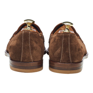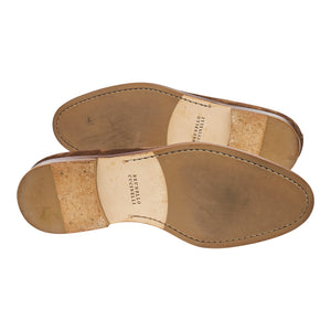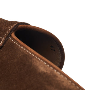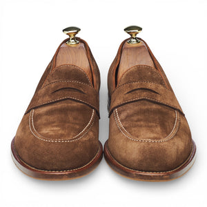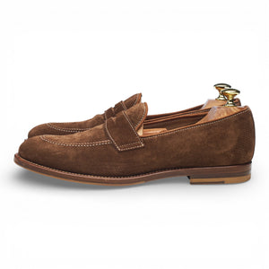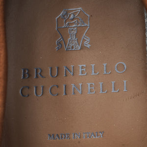 Brunello Cucinelli penny loafer in brown suede. In excellent used condition, showing minor signs of wear.