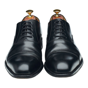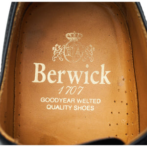 Berwick '1889' cap toe oxford in black calf. In excellent used condition, showing minor signs of wear and light creasing across the vamps.