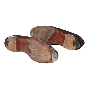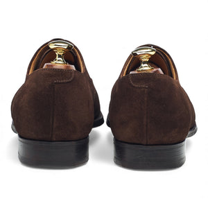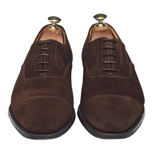 Crockett & Jones 'Connaught' cap toe oxford in dark brown suede. In excellent used condition, showing minor signs of wear.