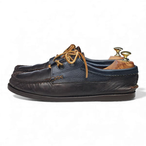 Yuketen 'Ghillie Moc' boat shoes in dark brown and navy blue calf. In excellent used condition with minor signs of wear.