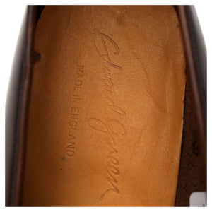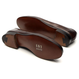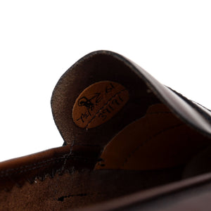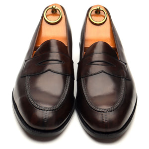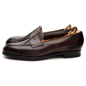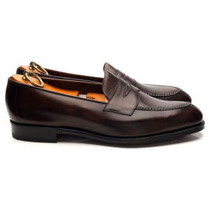 Edward Green 'Harrow' split toe unlined penny loafer in dark brown calf. There are some minor imperfections to the uppers.