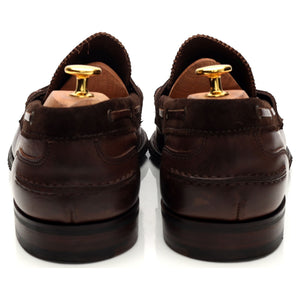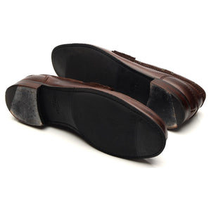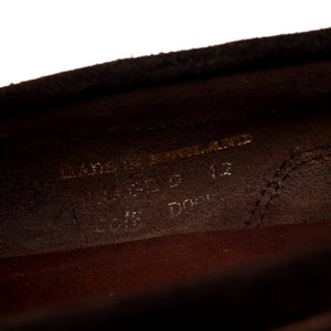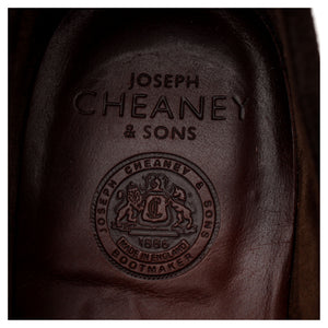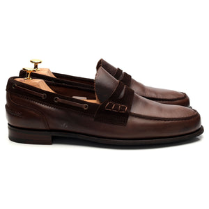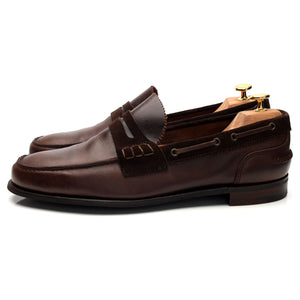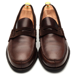 Cheaney 'Mirage' penny loafers in dark brown suede and brown pull up leather. In excellent used condition, showing minor signs of wear.