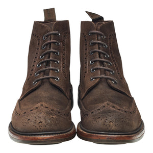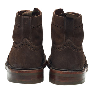 Loake 1880 'Bedale' brogue derby boots in dark brown waxed suede. In excellent used condition, showing minor signs of wear.