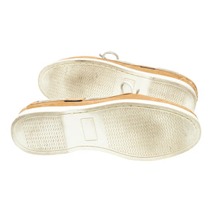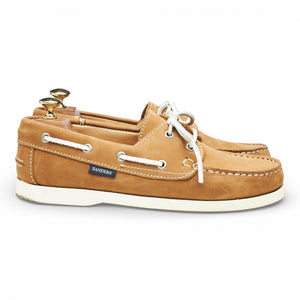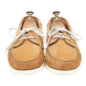 Sander's boat shoes in tan brown nubuck. In excellent used condition, showing minor signs of wear.