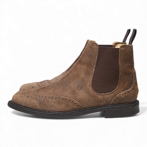 Church's 'Cransley' brogue Chelsea boots in light brown waxed suede. In excellent used condition, showing minor signs of wear.