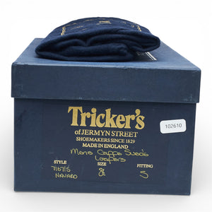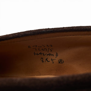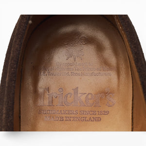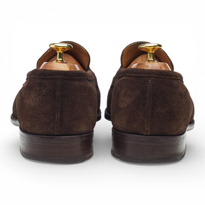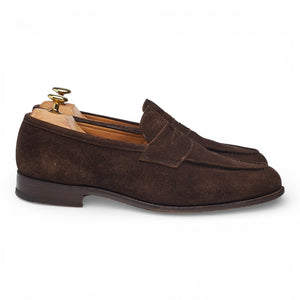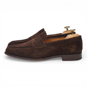Tricker's 'Havard' penny loafers in dark brown suede. In very good used condition, showing moderate signs of wear.