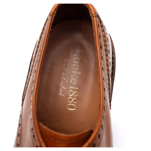 ローク1880「チェスター」ダービーウィングチップブローグ、タンブラウンのバーニッシュドカーフレザー製。使用感は若干あり、アッパーに軽いシワが見られますが、良好な中古状態です。