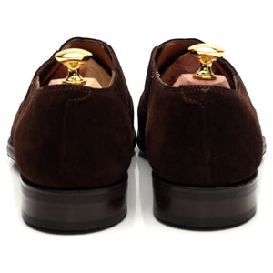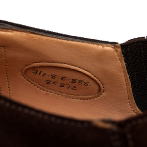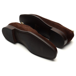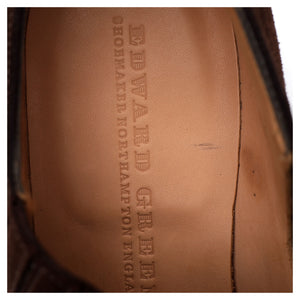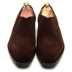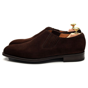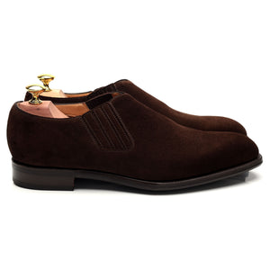 エドワード グリーンの、ダークブラウンのスエード素材を使用した伸縮性のあるサイドが付いたスリッポン ホールカット ローファー。